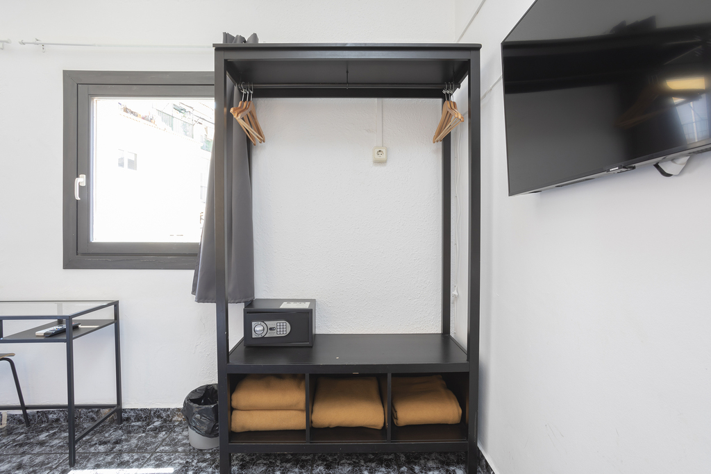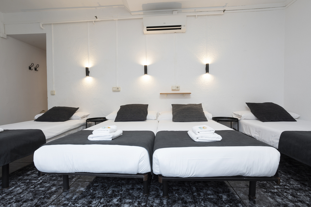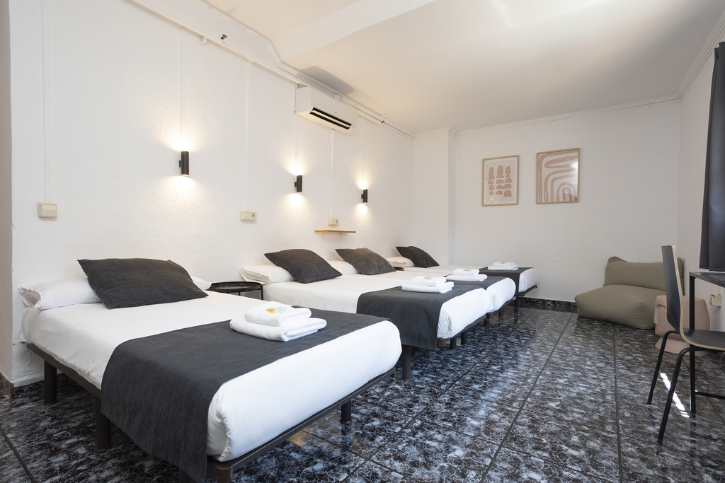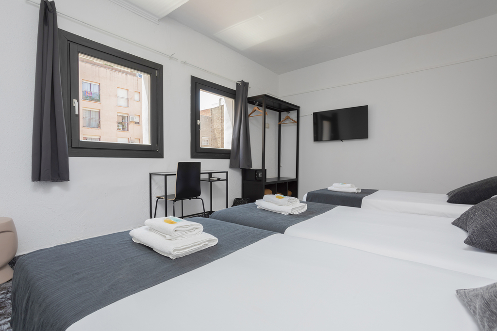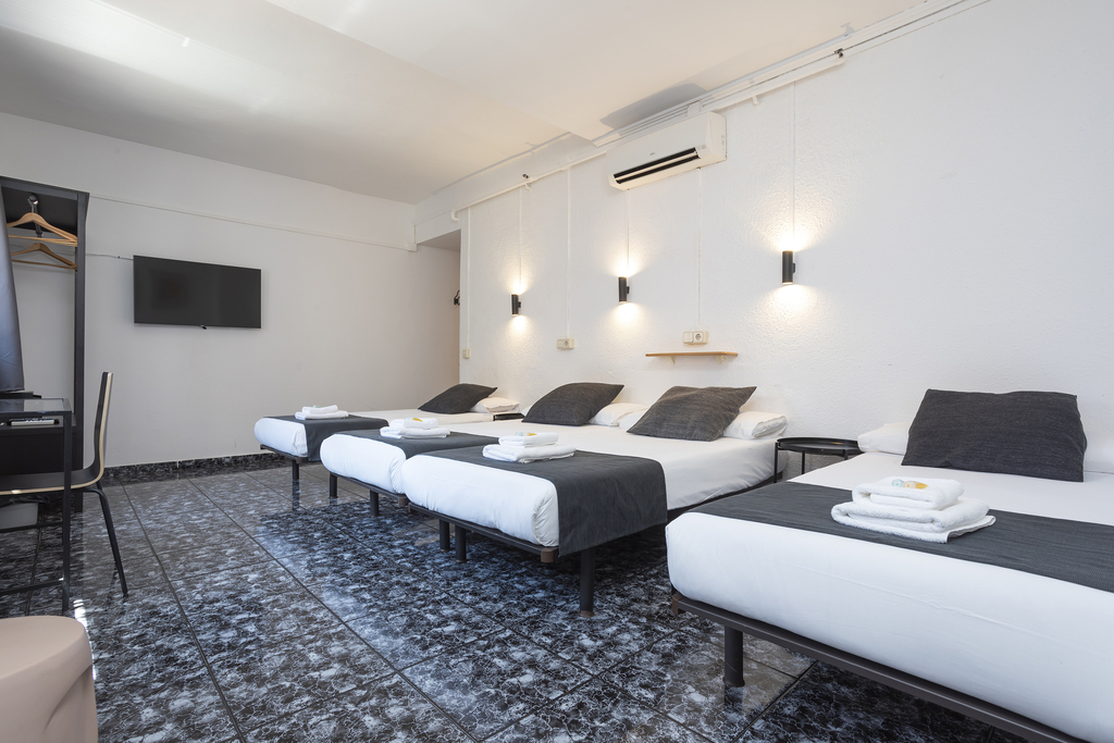 Quadruple room of 45 m², ideal for families or groups looking for space and comfort. Enjoy pleasant views of the building’s inner courtyard, perfect for a quiet and relaxing atmosphere. It features four adjoining single beds (90x190 cm), a private bathroom, a desk, and all the amenities you need for a perfect stay: independent air conditioning and heating, TV, and free Wi-Fi. A spacious and practical option, designed to make you feel at home.