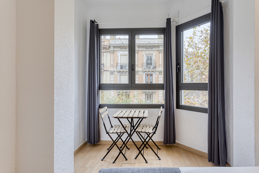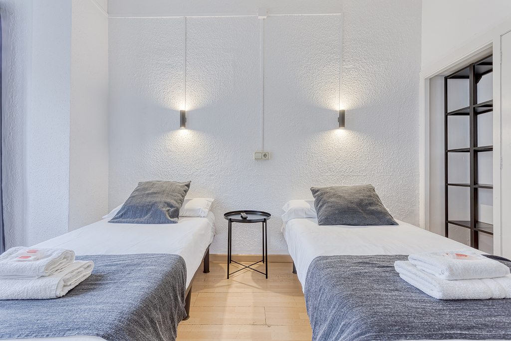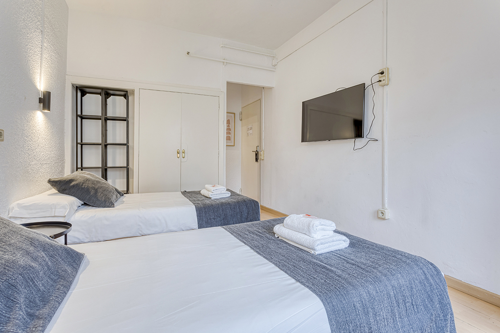 Double rooms with two single beds, featuring a total surface area of 30 m² and interior views. They offer two single beds (90 x 190 cm), a private bathroom, a functional desk, air conditioning, television, and Wi-Fi access, ensuring comfort and convenience for a pleasant stay.